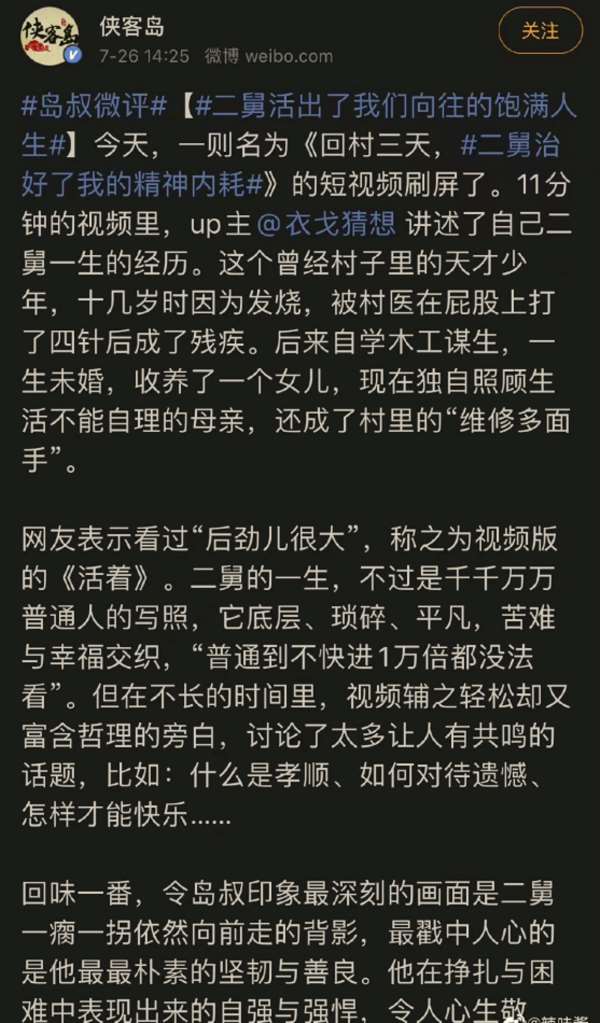 侠客岛们与其宣称“二舅活出了我们向往的饱满人生”,希图用“二舅”治愈年轻人的“精神内耗”,还不如认认真真地呼吁一下落实劳动法,严惩那些吃人不吐骨头的老板吧。