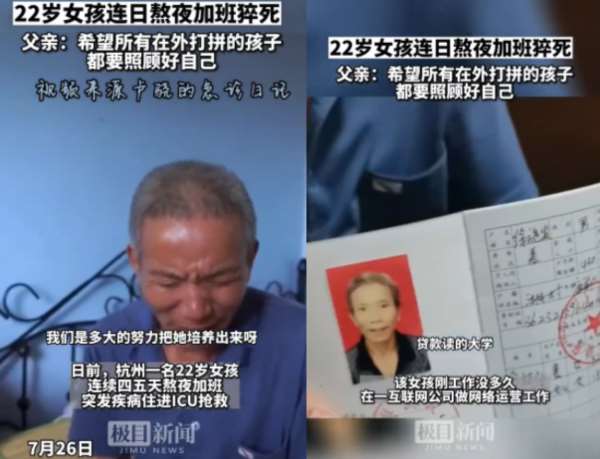 猝死的22岁女孩来自江西。她原本有一个哥哥,但在2015年因车祸去世,家庭经济十分困难,父母不辞辛苦,贷款让女孩读完大学。女孩毕业后进入杭州一家互联网公司做运营,没想到,女孩刚刚参加工作不久,刚要回报父母,却因为连续熬夜加班而“猝死”。