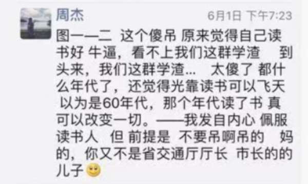 周劼在朋友圈里写道,“名校研究生都别想容易进我们单位。这个人当年仗着自己会读书。看不起我们这种靠父母的。呵呵,社会会教他。”