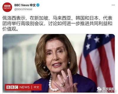 据英国知名反华谣媒BBC报道,此次佩洛西亚洲之行,主要是有四个国家,分别是日、韩、新加坡和马来西亚。佩洛西说,她将和上述四国讨论如何进一步推进共同利益和价值观。