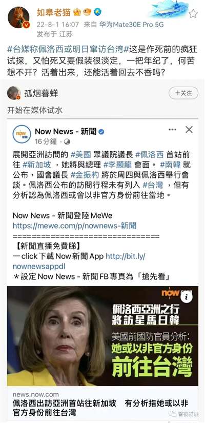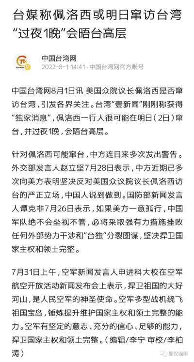 对于佩洛西扬言将窜访台湾,一些台毒分子感到前所未有的兴奋,据台媒报道,佩洛西将于8月2日晚间窜台,将在停留一晚,隔天,也就是3日上午与美国代理团伙勾结,预计当天中午离开。
