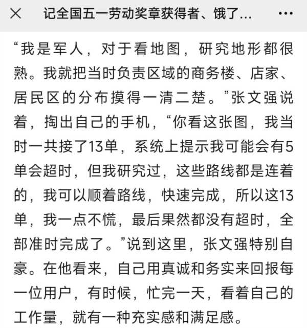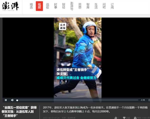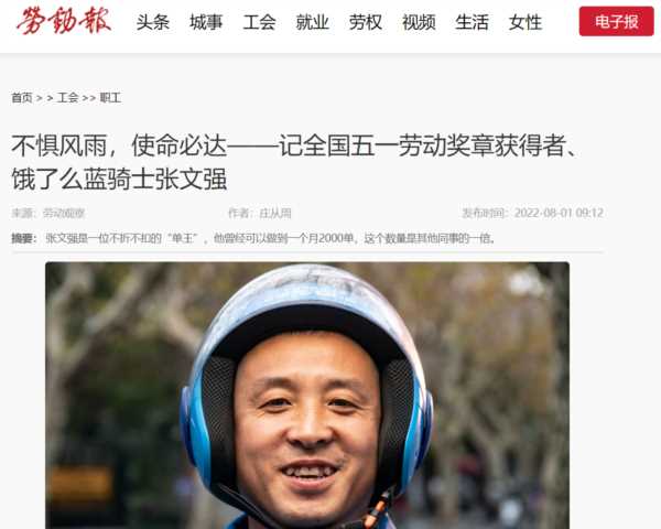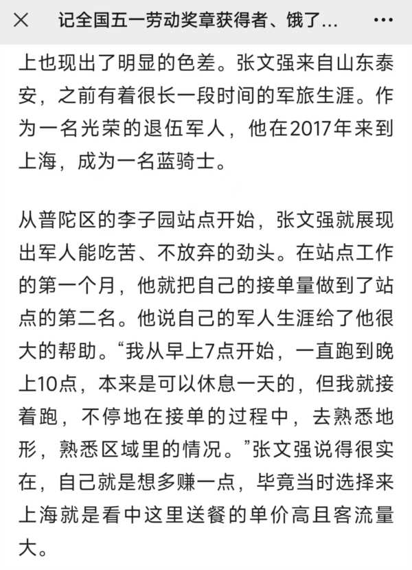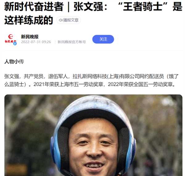 这两天,上海的新民晚报、劳动报、澎湃新闻等媒体,共同将镜头对准了“全国五一劳动奖章获得者、饿了么蓝骑士、来自山东泰安的退伍军人张文强”,劳动报的报道还得到了人民网的转发推荐。
