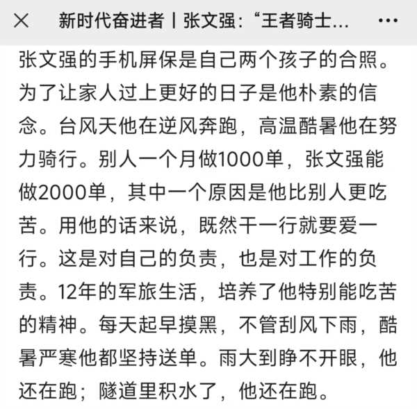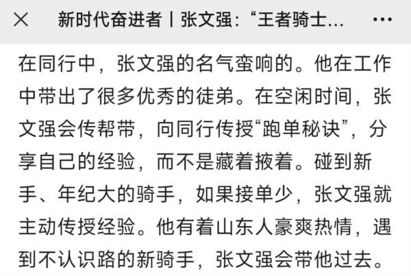 如果要对标毛主席缔造的人民军队“全心全意为人民服务”的总之,张文强真正值得称道的,就是张文强不藏私,对骑手同行传帮带、分享跑单经验:
