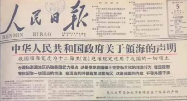 9月4日,《中华人民共和国政府关于领海的声明》向全世界公布,第一条即宣布:“中华人民共和国的领海宽度为12海里。”“一切外国飞机和军用船舶,未经中国政府许可,不得进入中国领海及其上空。”