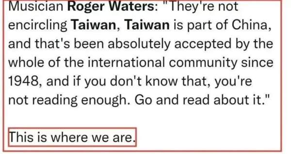 近日,平克(Pink Floyd)乐队的联合创始人、贝斯手罗格·沃特斯(Roger Waters)接受CNN采访时,怒怼主持人“台湾是中国的一部分!如果你不知道这一点,那只能说明你无知”的一段视频在中国互联网引发了巨大反响。
