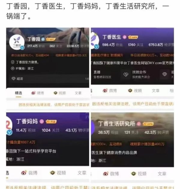 旗下系列“丁香园”、“丁香医生”、“丁香妈妈”、“丁香生活研究所”等账号全部被封。