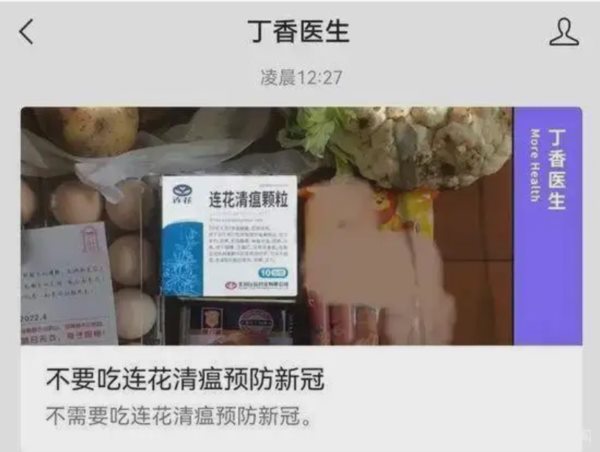 正值疫情封控,王思聪转发《世卫组织“推荐”连花清瘟,谁告诉你的?》,3天之后丁香医生发布《不要吃连花清瘟预防新冠》刷爆全网,表示“一种不能预防新冠的药物,被大批量发放给没有感染的健康人,这本身就是不应该发生的事情”,并认为给健康的市民发放连花清瘟真的没必要。