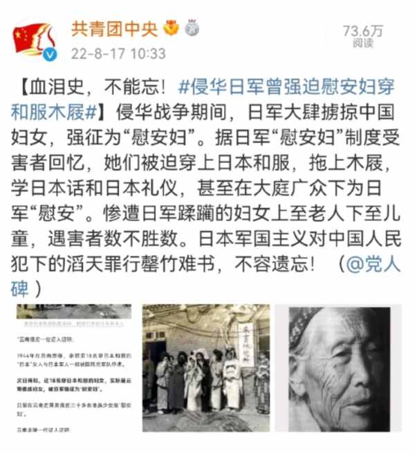 对此,共青团中央官微重磅发帖指出:【血泪史,不能忘!#侵华日军曾强迫慰安妇穿和服木屐#】侵华战争期间,日军大肆掳掠中国妇女,强征为“慰安妇”。据日军“慰安妇”制度受害者回忆,她们被迫穿上日本和服,拖上木屐,学日本话和日本礼仪,甚至在大庭广众下为日军“慰安”。惨遭日军蹂躏的妇女上至老人下至儿童,遇害者数不胜数。日本军国主义对中国人民犯下的滔天罪行罄竹难书,不容遗忘!