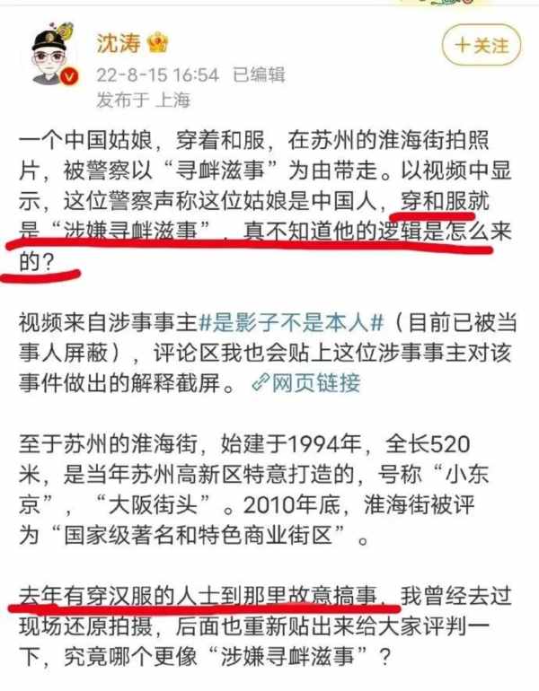 还有一个上海的大V“沈涛”,为了给精日的此次认知作战洗地,居然叫嚣说在中国国土上穿日本和服是自由,而中国人在中国的国土上穿汉服是“故意搞事”,真是脸都不要了。