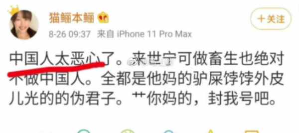 这个“猫鲡”还在其另一个小“猫鲡本鲡”上,曾公然发布辱华的帖子,内容极其恶毒,甚至叫嚣“来世宁可做畜生也绝对不做中国人”。