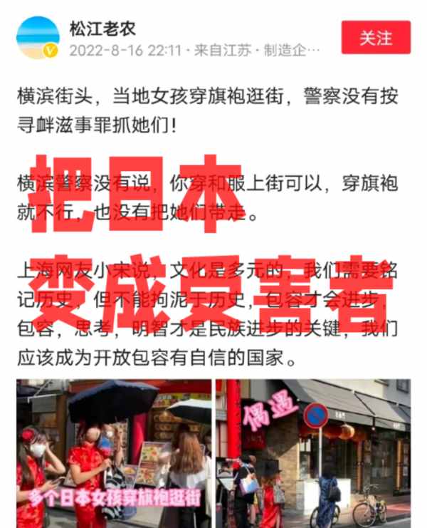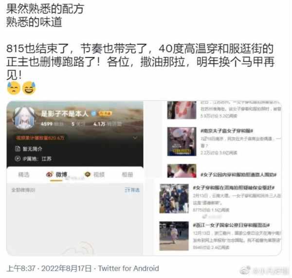 我们知道,那个写小作文的已经删帖跑路了。这种人会在接下来的重点日期前再次以其它身份现身,继续炒作日本和服。