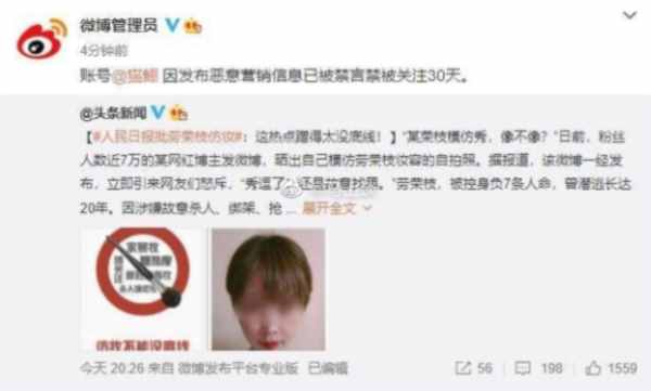 2020年时,就是这个“猫鲡”,专门发出模仿杀死多人的女魔头劳荣枝的自拍照,美化、歌颂杀人犯,遭到人民日报的点名批评。