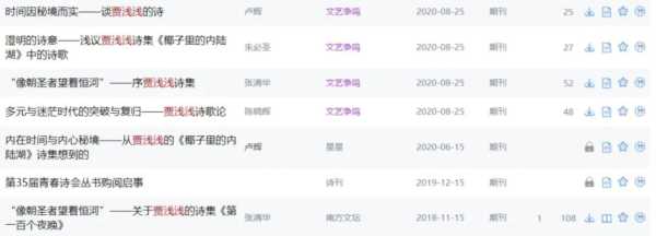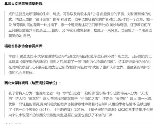 西北大学文学院博导—陈晓辉评价说:孔子曾将人分为"生而知之者"和"学而知之者",约翰·斯图尔特·米尔进而将诗人分为"天成的"诗人和"炼就的"诗人。贾浅浅可能就属于"生而知之者",注定是"天成的"诗人,甫一出道,就像一只轻盈的百灵,用婉转嘹亮的歌声恣情肆意地吟诵着对自然和人世的思考与情怀,连续出版了《第一百个夜晚》、《行走的海》、《椰子里的内陆湖》三本诗集,不但在向来以小说见长的陕西文坛特别突出,甚至在全国也赢获了不俗的口碑。