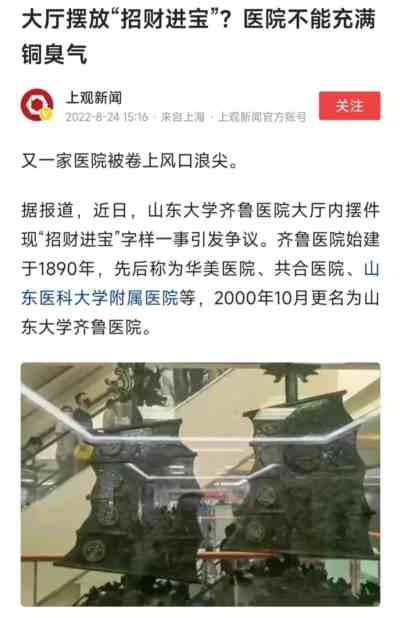 从“虎虎生威迎新年,手术室里全是钱”,到“怎么让病人长期留下来,给我们排队交钱”,再到齐鲁医院摆设“招财进宝”,都可以说明,全国各大医院正在一门心思“创收”。