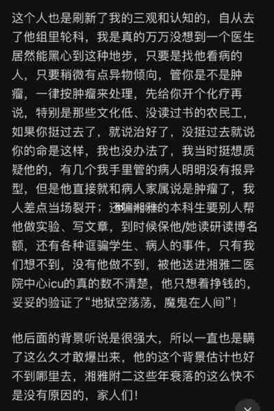 湘雅二院出了刘翔峰此等人物,已经不是个人作风、职业道德的问题了,必然是出现了系统性问题。在我看来,要调查,整个医院都应该被彻查,而且应该异地侦查和审理。