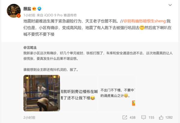笔者居住的小区,许多人都跑了下去,然后三四十分钟之后,等人的情绪平稳、确认安全之后,社区和物业开始让人都回家去。