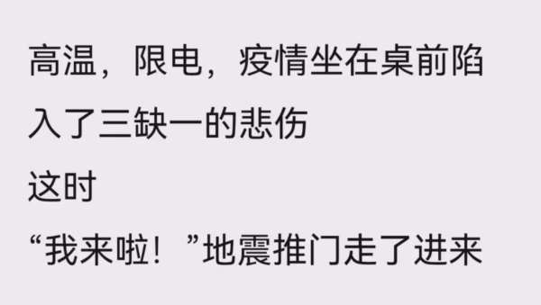 再往大了、远了说,四川人民生性乐观,喜欢调侃。这次yi情+地震,又诞生了许多段子。