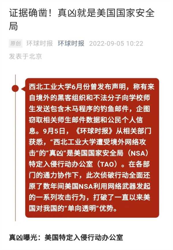 9月5号,据环球时报等官媒报道,中国国家计算机病毒应急处理中心和360公司,发布了中国西北工业大学遭到境外网络攻击的调查报告。据称,网络攻击行动是由美国国家安全局下属的“特定入侵办公室”(TAO)组织实施的,于今年6月22日被西北工业大学发现并报案。