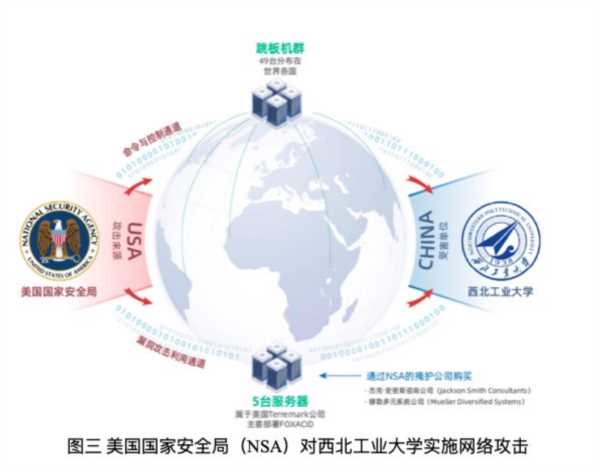 中国国家计算机病毒应急处理中心和360公司经过溯源,认为对西北工业大学实施的网络攻击,是由NSA下属信息情报部数据侦察局的TAO部门实施的,甚至连具体的入侵指挥官都被查了出来。从透露出的信息看,对西北工业大学的网络入侵已经持续了多年,窃取的敏感信息据说有140G,目前已经被全部还原,并复原出了NSA对我网络攻击的全貌。