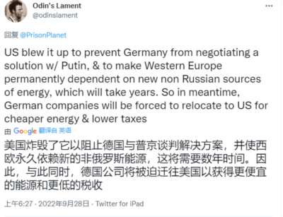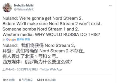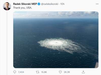 但值得注意的是,欧洲议会议员、波兰前外长西科尔斯基27日却在推特上将这次爆炸和美国联系起来。他发了“北溪”管道发生事故的现场图,并配文“谢谢你,美国。”