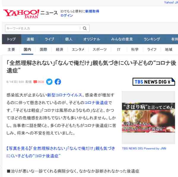 今年8月,日本Yahoo登的一篇TBS的新闻报道《“完全不被理解”,“为什么只有我”,父母也很难察觉的孩子的“新冠后遗症”》,曾霸屏热搜,引起日本网友热议。有的孩子“总觉得有一块巨石压在身体上”,还有的孩子在很多时候都是一头雾水,昏昏沉沉的感觉等等,总之,他们的记者在采访中发现,因为新冠后遗症而无法上学的孩子有很多。