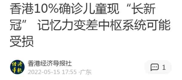 今年5月份时,香港经济导报曾发表一篇题为《香港10%确诊儿童现“长新冠”记忆力变差中枢系统可能受损》的报道。报道表示,香港玛嘉烈医院儿童传染病科顾问医生关日华在一个电台节目中表示,至今为止(5月14日)136名儿童复诊,大约有10%的人出现新冠后遗症,即长新冠症状,包括失去味觉、嗅觉,以及记忆、认知、集中能力变差等。