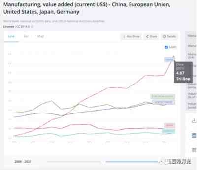 再看中国,当我们在短期内通过“清零政策”恢复了生产和生活秩序后,2021年中国制造业增加值达到了4.87万亿美元,同比增长26%,增加值接近全球30%,而G7集团总和也就5.30万亿美元。