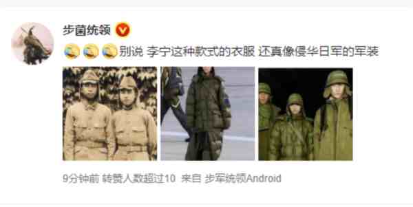 原来,李宁的这款棉服,给人的第一印象,像极了侵华日军的军服。