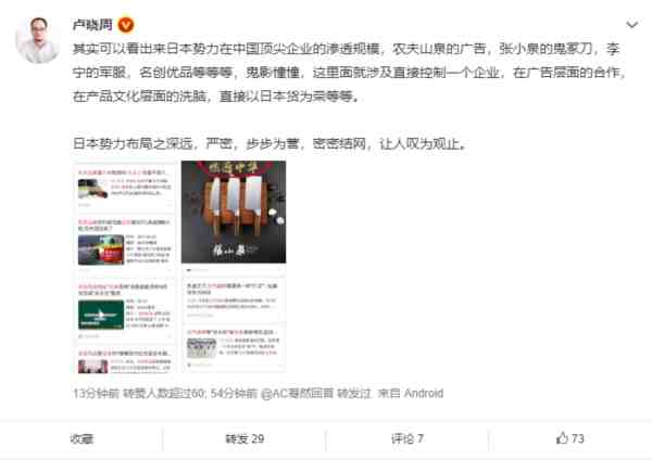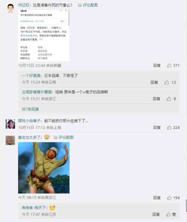 有网民的评论明显更深刻,指出从农夫山泉的广告、张小泉的鬼冢刀、名创优品到现在李宁的军服,可以看出日本势力在中国顶尖企业中的渗透规模、产品文化层面的洗脑,布局之深远,严密,步步为营,密密结网,让人叹为观止。