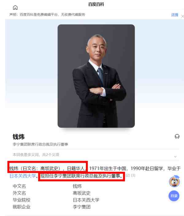 网民还发现,目前李宁集团联席行政总裁及执行董事,原来就是个日本公民高坂武史。