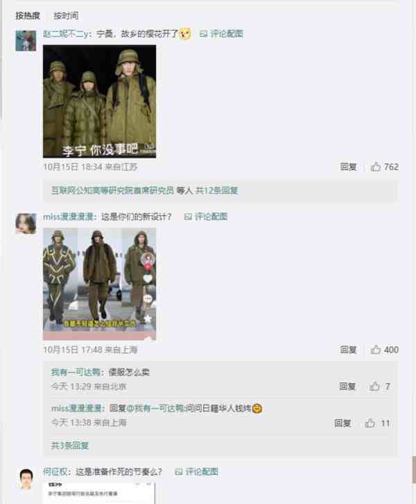 有网民则提醒李宁公司:之前其他品牌的类似设计防晒帽就有人开玩笑说像鬼子了,不过人家不是军绿色,ln这个造型再加这个颜色,从设计到售卖那么多环节就没人觉得看起来很怪吗?