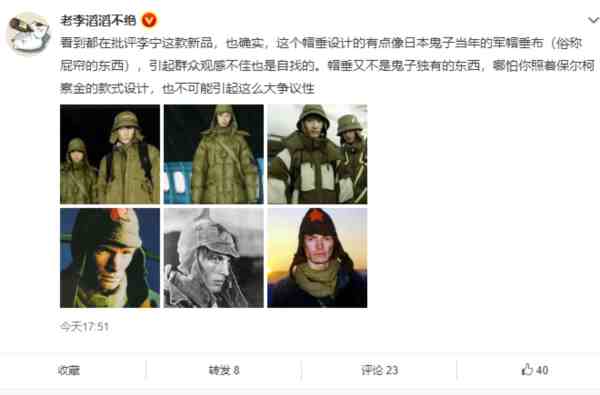 有知名博主指出李宁这款产品引起群众观感不佳是自找的,还指出那个帽垂本不是鬼子独有的东西,如果照着保尔柯察金的款式设计就不会引起这么大争议。