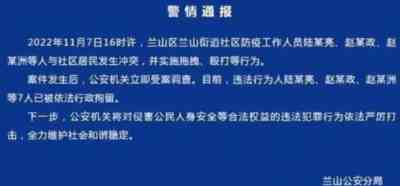 11月7日16时许,兰山区兰山街道社区防疫工作人员陆某亮、赵某政、赵某洲等人与社区居民发生冲突,并实施拖拽、殴打等行为。
