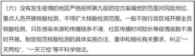 这次的“20条”里的第6条,原文是说,“没有发生疫情的地区严格按照第九版防控方案确定的范围对风险岗位、重点人员开展核酸检测,不得扩大核酸检测范围。”