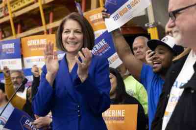 当地时间2022年11月13日,美国拉斯维加斯,内华达州民主党参议员凯瑟琳·科尔特斯·马斯托在当地工会支持者的簇拥下,在庆祝她赢得美国参议员竞选的新闻发布会上发言。