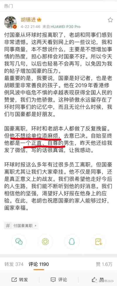 他非但不吭声,还默默删掉了付国豪离职时他所发的帖子,就是图二这条“不想给单位添麻烦”的帖子,被胡锡进删掉了!