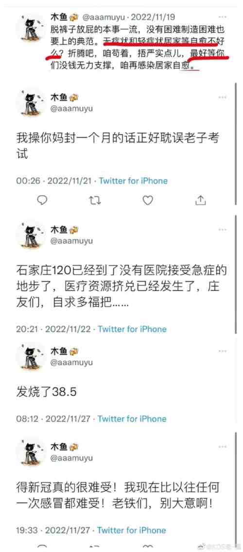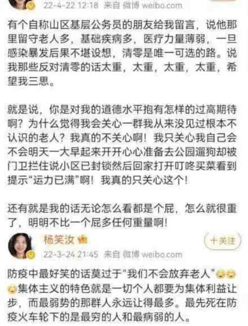 “有个自称山区基层公务员的朋友给我留言,说他们那里留守老人多,基础疾病多,一旦感染后果不堪设想,清零是唯一的选择。”“为什么觉得我会关心一群我从来没见过根本不认识的老人?我真的不关心啊!我只关心我自己会不会明天一大早起来开开心准备去公园遛狗却被门卫拦住说小区已封锁回家打开叮咚买菜看到提示运力已满啊!我真的只关心这个!”