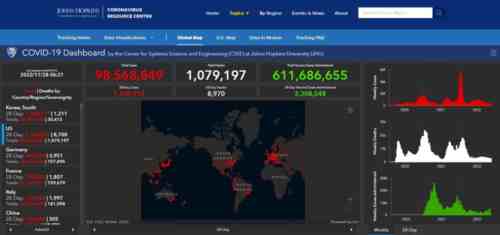 根据美国约翰斯·霍普金斯大学统计数据,截至北京时间11月28日6时21分,美国新冠肺炎累计感染病例达到98568849例,累计死亡病例达1079197例 图源:观察者网