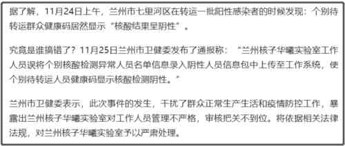 然后,11月25日兰州市卫健委发布了通报称:“兰州核子华曦实验室工作人员误将个别核酸检测异常人员名单信息录入阴性人员信息包中上传至工作系统,使个别待转运人员健康码显示核酸检测阴性。”