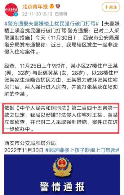 据北京青年报,11月25日,西安雁塔区某住户夫妻二人以噪音扰民为由,暴力破坏他人住宅房门,强行进入房内并殴打他人。依据《刑法》,以涉嫌非法入侵住宅对两人采取强制措施。