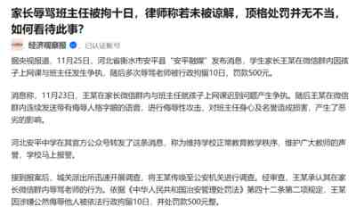 据央视报道,11月25日,河北省衡水市安平中学,学生家长王某在微信群内因孩子上网课与班主任发生争执,随后多次辱骂老师被行政拘留10日,罚款500元。