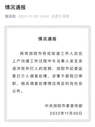 11月30日,浏阳市的情况通报出来了,“涉事人员现已停职,相关调查处理情况将及时向社会公布。”