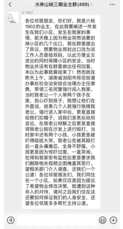 要不是居民家中安装了监控,还不知道找谁说理去。而整个事件的起因,仅仅是因为居民在群里提出对物业封掉小区几个出口的异议,提议把“封出口”改为“查双码”,方便业主进出也保障小区安全。