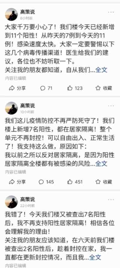 比如,最近网上有一个跳得特别积极的躺平人,反对集中隔离,那是态度相当坚决,但当自己自己住的楼出现了阳性之后,他开始承认自己错了。