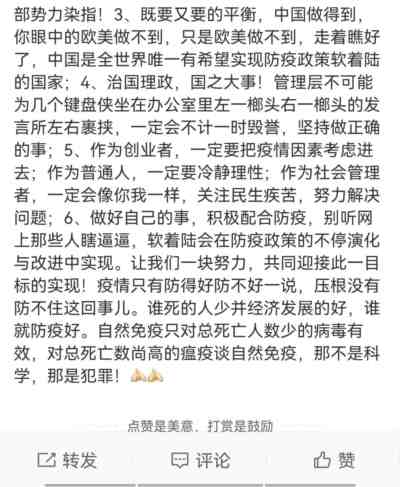 但不管怎么样,就是一些恨国的人,掌握了中国很大一部分话语权,他们在明里暗里以偏概全攻击中国的动态清零政策,在以不同方式要求中国学习西方躺平。