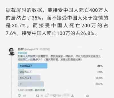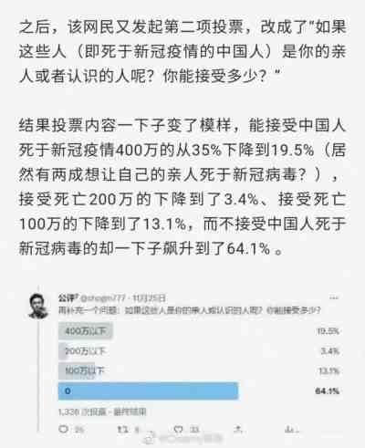 躺平派并不介意中国放开后死几百万人。当然这个前提是死的是别人,而不是他们自己或家人。同样是那个投票,改成了“如果这些人(即死于新冠疫情的中国人)是你的亲人或者认识的人,你能接受多少?”,结果投票内容一下子变了,能接受中国人死亡400万人的从35%降低到了19.5%。不接受中国人死于新冠病毒的却从30.7%一下子飙升至64.1%。