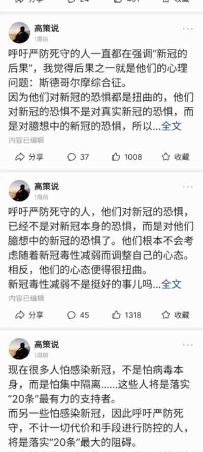 关键是什么是过度防疫的标准?我认为一刀切的层层加码是过度防疫,但他们扯来扯去,把动态清零当成过度防疫,还是在反对动态清零政策本身。