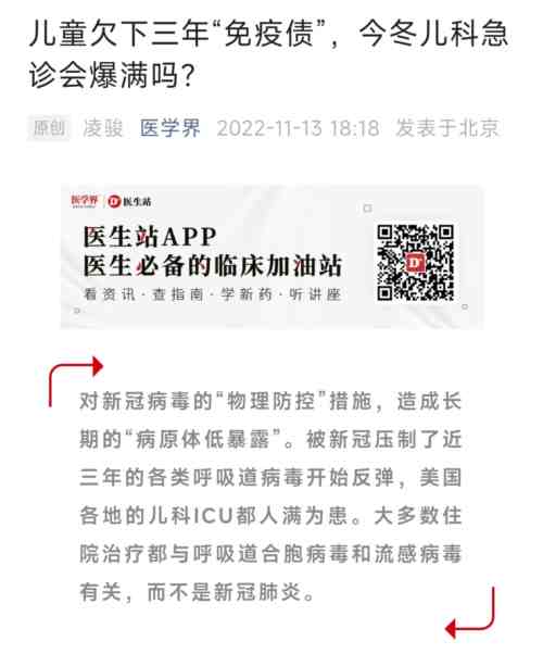 曾在B轮融资拿到复星投资、C轮拿到红杉资本投资的鼎鼎大名的“医学界”援引香港大学生物医学学院教授金冬雁等人说法称,这两年“物理防控”措施所造成的免疫力下降,“免疫债”问题开始显现,中国的儿童群体也逃不过“免疫债”。