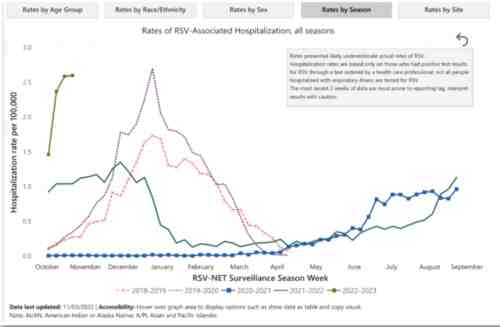 据美国疾控中心发布的监测报告,今年9月以来,美国因感染RSV病毒而住院的患儿数迅速飙升,截至10月底,累计住院数已达到通常12月份才能达到的水平,周住院人数也达到了过去5年来的峰值。