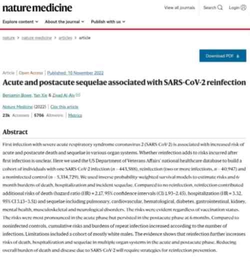 11月份,《自然》医学杂志再次刊登了一篇重磅研究论文。研究对象是美国退伍军人事务部在2020年3月1日至2022年4月6日期间收集的数据,这些数据涉及44万3588名感染过一次新冠病毒的患者和40万947名感染过两次或两次以上的患者以及530万名未感染者。研究结论表明:无论是否接种了新冠疫苗,相较于首次感染新冠,再次感染新冠后患者的死亡风险增加了一倍多,住院风险增加三倍多。